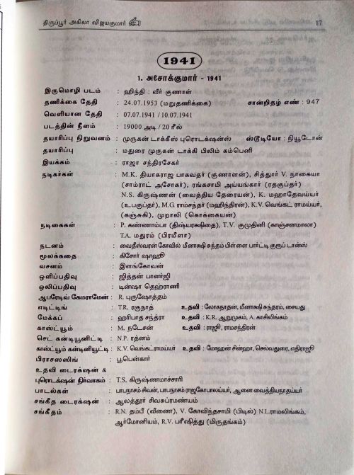 It contains complete information about Tamil films from 1931 to 1950. Apart from what we are used to seeing in Hindi Film Geet Kosh eg, he has also added much more information like story, dialog, dances, cinematography, etc. it appears that he is connected with the Tamil film industry. He is working on other volumes.