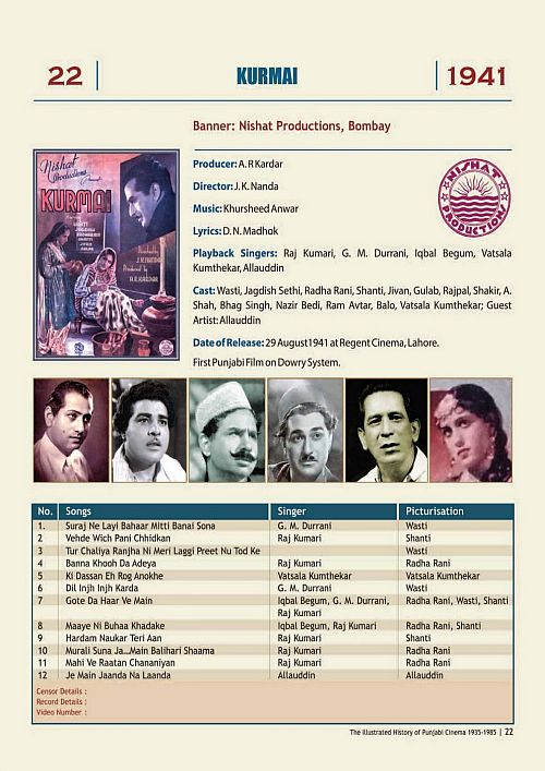 It was entitled Illustrated History of Punjabi Cinema 1935 to 1985. It is in English and in color. This was also styled on Hindi Film Geet Kosh and had similar information. There were three additional items. One, there were lots of color pictures. Two, the film release date was also given. Three, picturization information of songs was also provided.