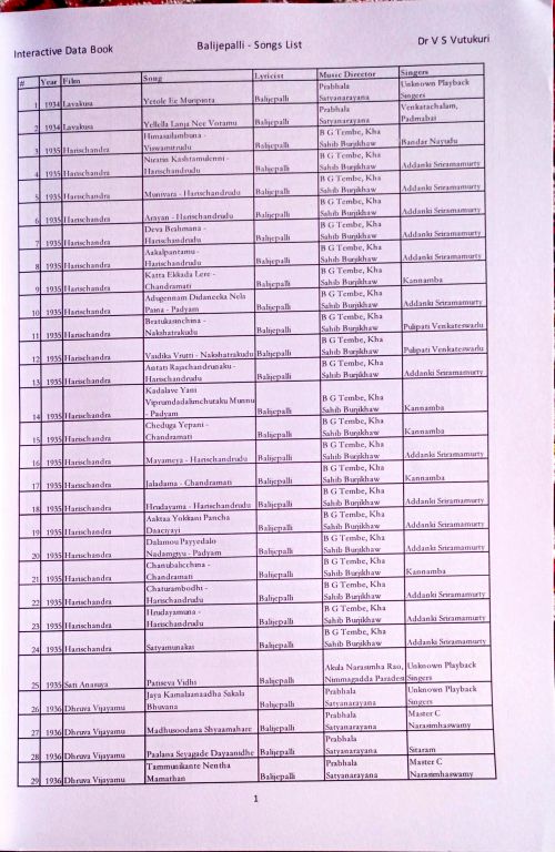 Compiling information about Telugu films (1932-2000) has been undertaken Dr Venkata Vutukuri. This is a huge project containing information about almost 5,000 films. He has published it in two dozen books. There are two volumes of filmography. There are separate volumes on producers, directors, music directors, lyricists, singers, dialog writers and songs.
