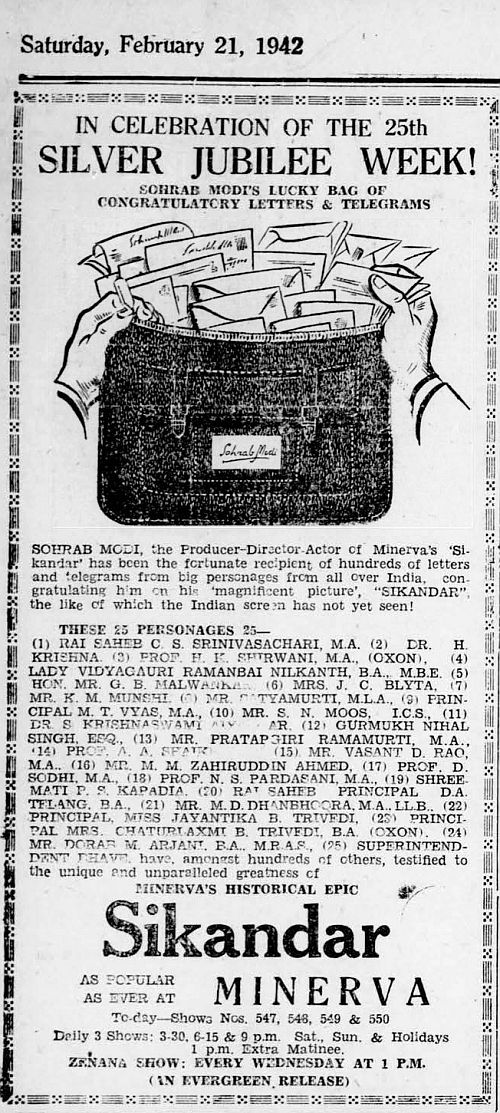 Film Sikandar celebrates silver jubilee in Bombay, Minerva Cinema Hall