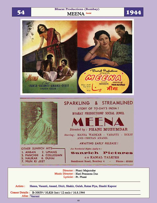 When I bought the second volume (1941-1950) of the HFGK in late 80s, I browsed through it eagerly. I was intrigued by the film Meena in 1944 where the cast mentioned Vasanti, Hansa and an actor named Anand. I suspected it might be Dev Anand. I kept wondering about it. Later on I mentioned this to (late) Gurcharan Singh Sandhu. He said he had asked Dev Anand when he visited the UK and he told him that it was not him and he also did not know who it was. Har Mandir Singh 'Hamraaz' and I also discussed it a few times.