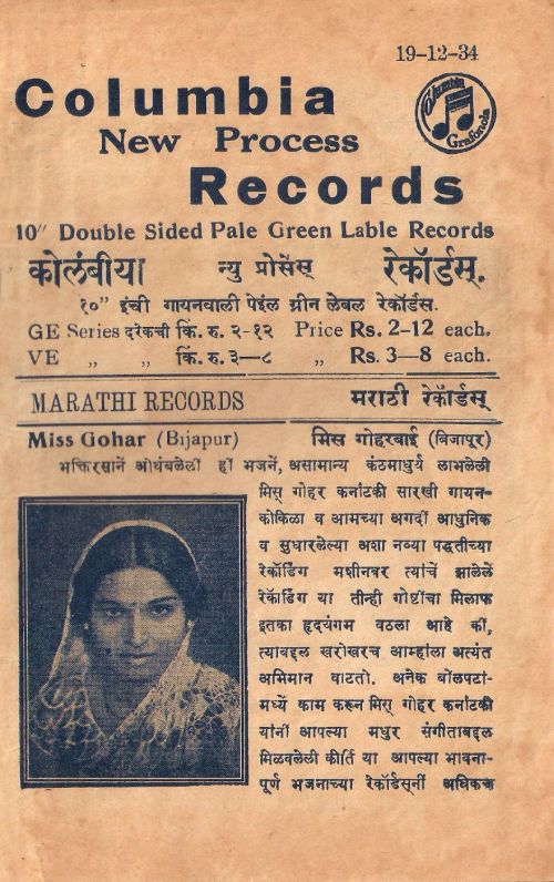 Miss Gauhar from Bijapur. Title page of a record catalog, Suresh Chandvankar collection